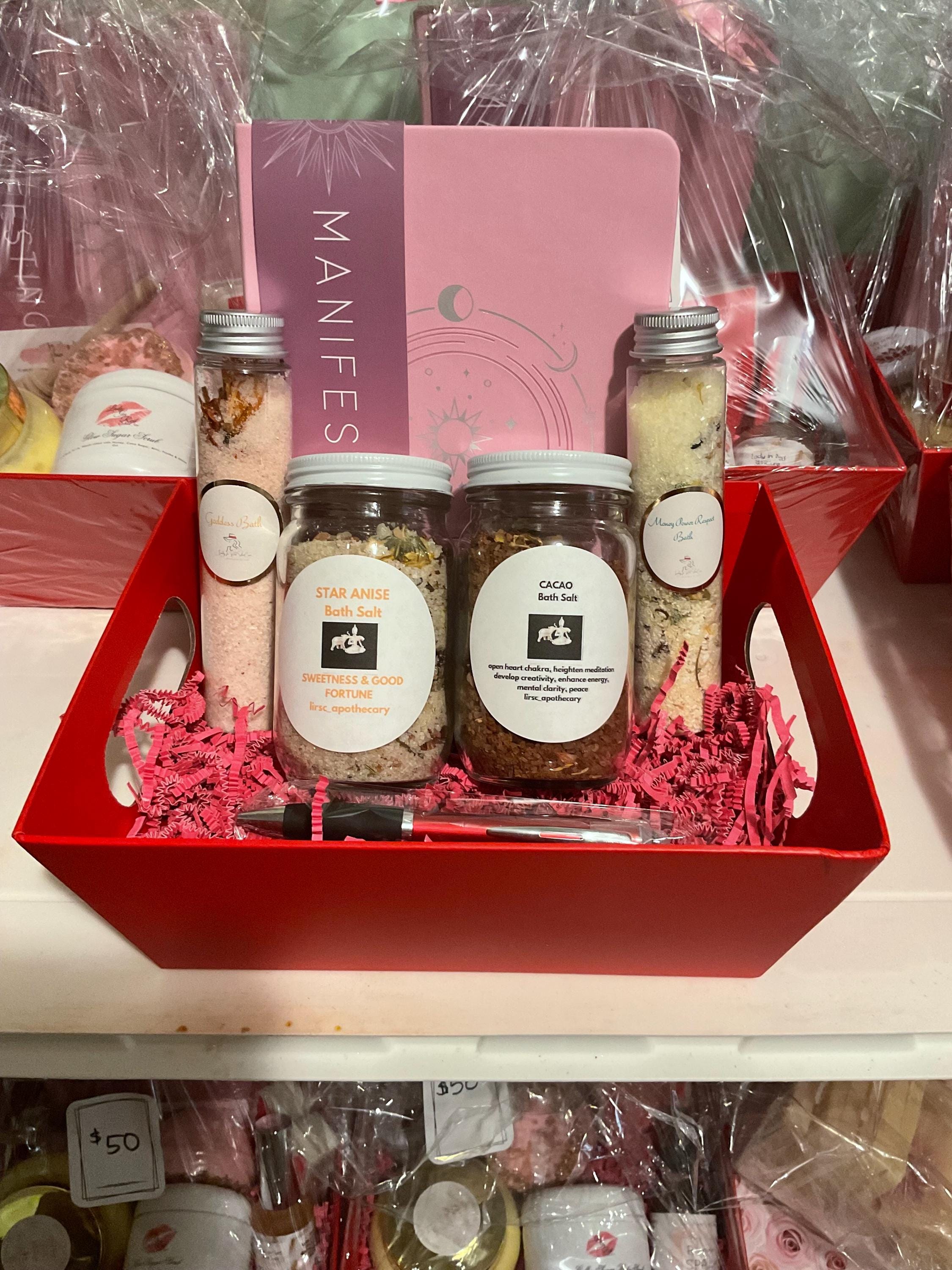 Our gift basket includes our charged bath salts created with good intentions to suit your Spiritual wellness goals. Contains Goddess Bath, Open Road Bath aka Money Power Respect Bath, Star Anise Bath, Cacao Bath, a manifestation journal and pen.