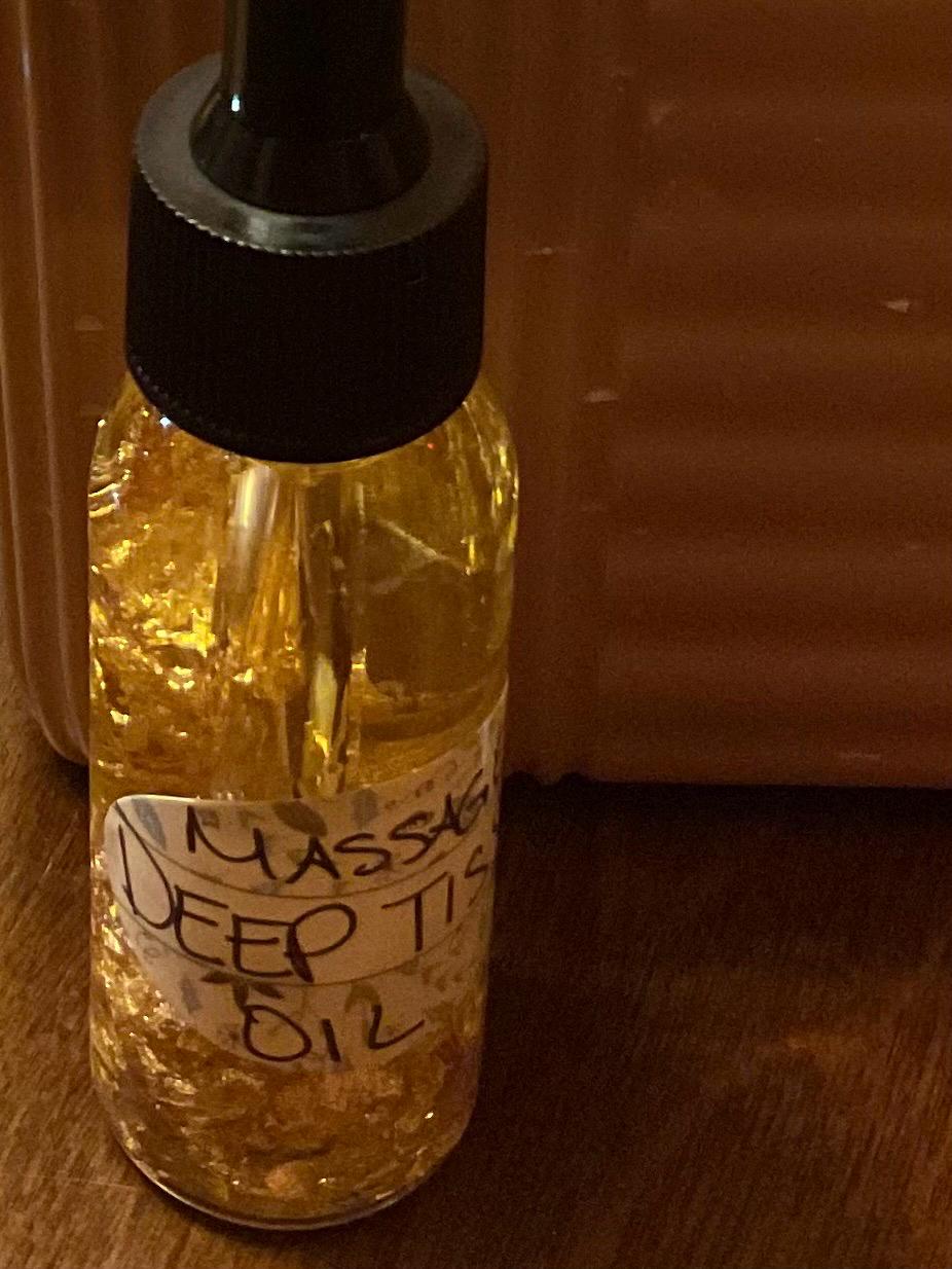Deep Tissue Massage Oil: Used by applying sustained pressure and slow strokes to target the deeper layers of muscle and connective tissue, helping to relieve pain, reduce tension, and promote healing. Base: Coconut Oil, Fragrance: Mint, Contains: Gold Leaf, Proprietary Essential Oil Blend