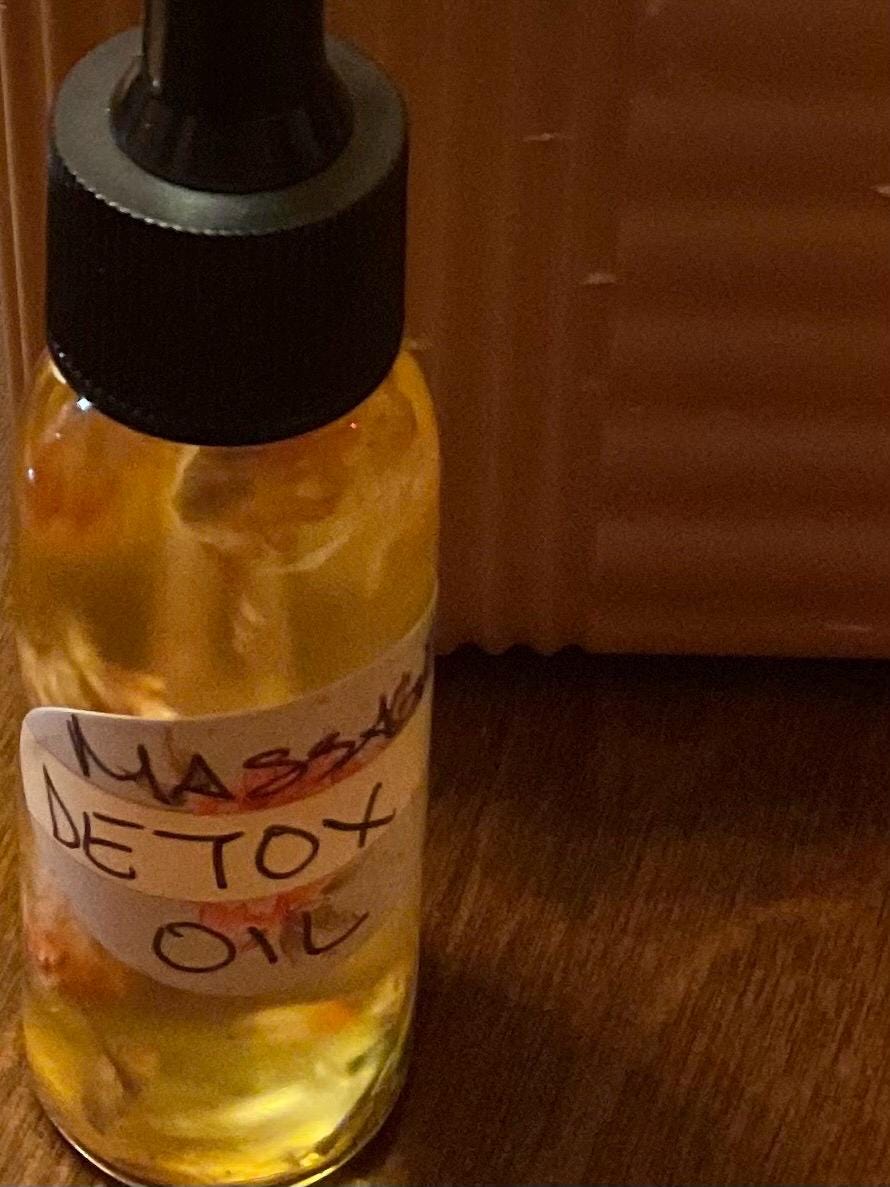 Detox Massage Oil: Created to help boost mood and energy while offering an overall sense of wellness. Base: Coconut Oil, Fragrance: Green Tea, Contains: Red Plum Petals, Proprietary Essential Oil Blend